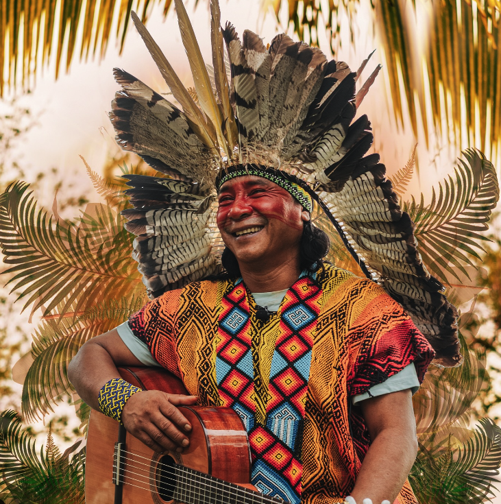 Ninawa Pai da Mata is a highly respected Huni Kuin spiritual leader, chief of the Novo Futuro Village, and a master of ancestral healing traditions from the Amazon. His name, "Pai da Mata" means "Forest Father," reflecting his dedication to the wisdom and spiritual practices of his people, including the use of sacred medicines and traditional music, with his motto being "só alegria"(only joy!).